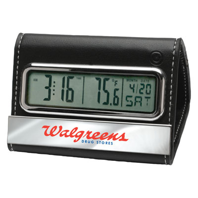 Stylish faux leather folding digital travel or desk clock with magnetic closure and metal trim. Features a large LCD digital display with alarm clock, month, date, day of the week and temperature. Battery Included.
