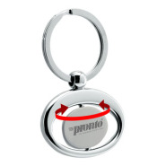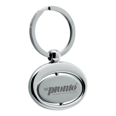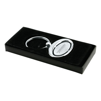Oval shape swivel key holder with split key ring. Features a metal oval inside that swivels with a chrome plated finish. Keychain is packed in a deluxe 2 piece black gift box with inlay tray.