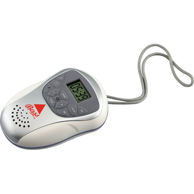 AM/FM alarm clock radio features water resistant construction, back light LCD display and convenient hanging cord. Uses 3 AAA batteries (not included).