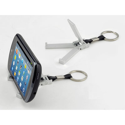 Mobile phone stand keychain opens and folds away with ease. Made of steel, the key chain phone stand has a sturdy feel and durability.