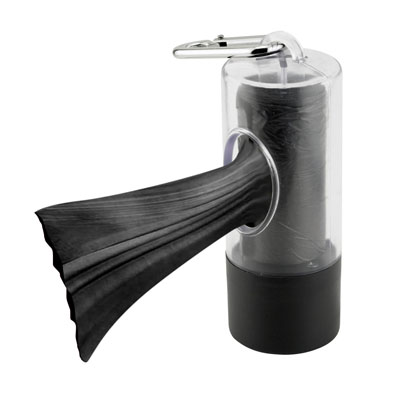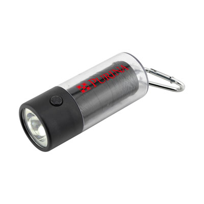 Dog bag dispenser with flashlight and carabineer. Includes 20 black biodegradable pet waste bags. Batteries included.