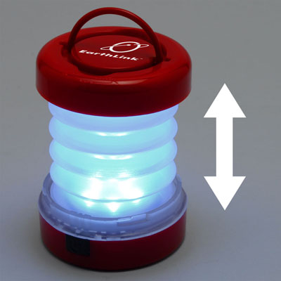Collapsible camping lantern features 5 bright LEDs. Switch between a bright light or blinking light at the press of a button. Uses 3 AAA batteries (not included).