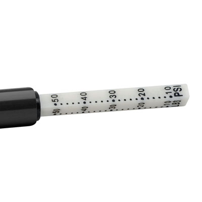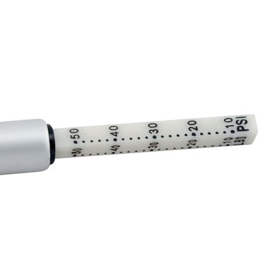 Slim stick tire gauge with keychain. Measures up to 50 PSI of pressure.