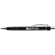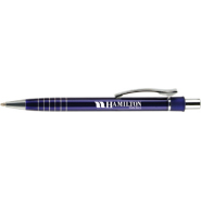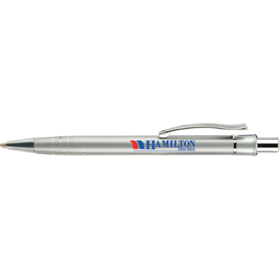 Retractable metal ball point pen has a contoured metal clip decorated with metal rings for added appeal.