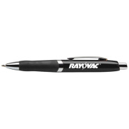 Retractable metal pen features a unique oblong shape body, rubberized grip and chrome accents.