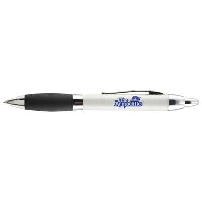 Retractable metal ball point pen with chrome accents, contoured barrel and grip section.