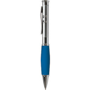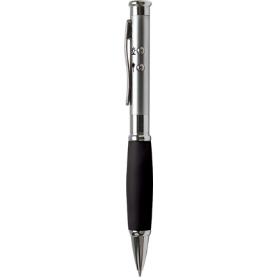 3 in 1 twist action metal ballpoint pen with soft rubber grip, FDA approved laser pointer and LED light packed in a wood grain case. Batteries included.