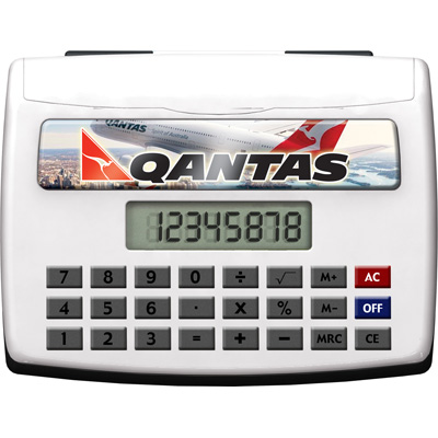 Compact 8 digit calculator features an inside compartment to hold business cards. Great for SpectraDomeª full color decoration. Batteries included.