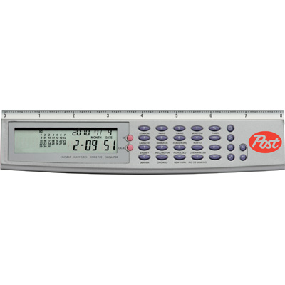 Multi function calculator features a 16 city world time clock, countdown timer alarm, calendar, alarm clock and detachable 8" ruler. Batteries included.