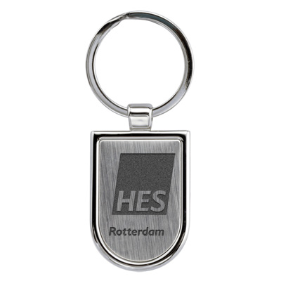 Oval shape 2 tone metal key holder with split key ring. Features chrome accents and a matte face plate. Keychain is packed in a deluxe 2 piece black gift box with inlay tray.