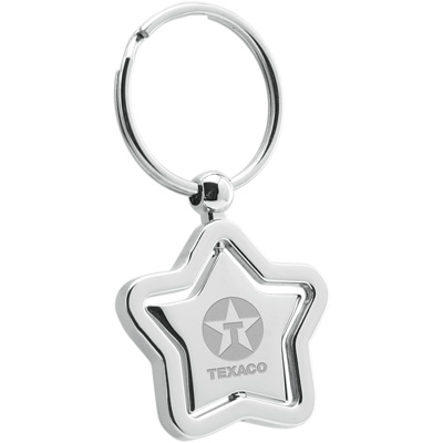 Star shape swivel key holder with split key ring. Features a star inside that swivels with a chrome plated finish. Keychain is packed in a deluxe 2 piece black gift box with inlay tray.