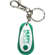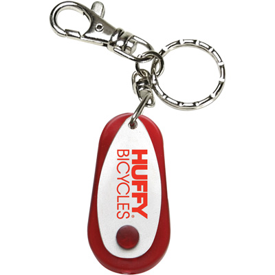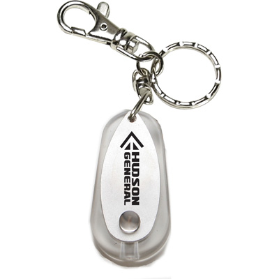 LED light key holder with soft rubber button. Light glows brightly through the body. Features a split ring and j-hook. Batteries included.