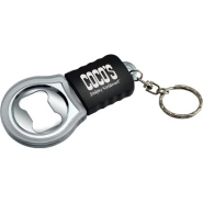 Unique bottle beverage opener keychain with LED light. Features a large split key ring and stylish acrylic accents. Batteries included