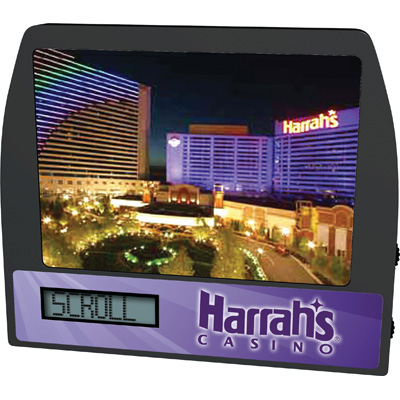 Scrolling message clock with AM/FM radio and photo frame (3 1/2" x 5"). Set your own message that will scroll on the LCD display alternating between the current time and your message. Uses 2 AA batteries (not included).