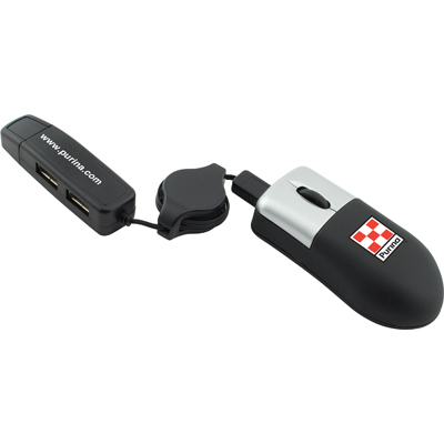 Compact mini-mouse with 2 button scroll wheel, retractable USB cord and extender 2 port USB hub.