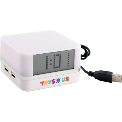 4 port USB Hub with color changing light and dot matrix style display clock. Battery included.