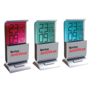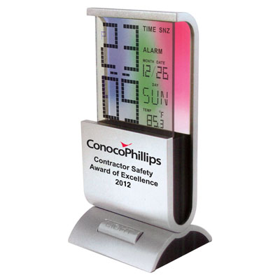 Multi function and rainbow color changing LCD digital alarm clock. Display changes 7 different colors. Features a large see-through digital screen that displays the time, date, day and temperature. Also includes a 24 hour countdown timer. Uses 3 AAA batteries (not included).