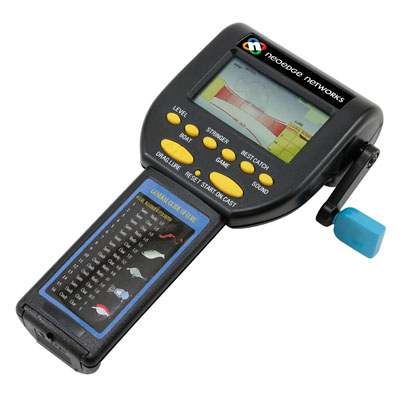 Fishing game. Pull back, cast and wind in your lure with this simulated fishing game that vibrates when you get a nibble. Uses 2 AA batteries (not included).