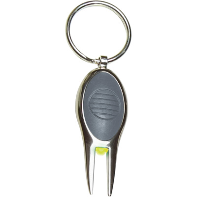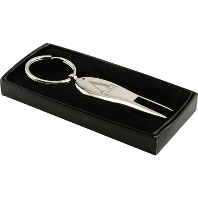Divot repair golf tool key holder with light and a large split key ring. Packed in a deluxe gift box.