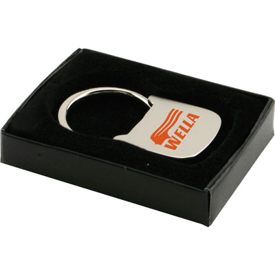 Pull-n-twist executive metal key holder with satin silver finish. This key tag is packed in a 2 piece deluxe black gift box with inlay tray.