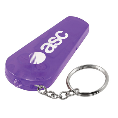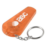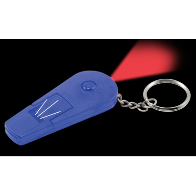 Keychain red LED press light with built-in whistle and split key ring. Battery included.