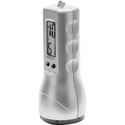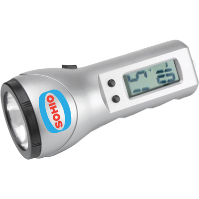 Powerful flashlight with jumbo vertical LCD alarm/time display. Great for traveling and emergencies. Uses 2 AA batteries (not included).